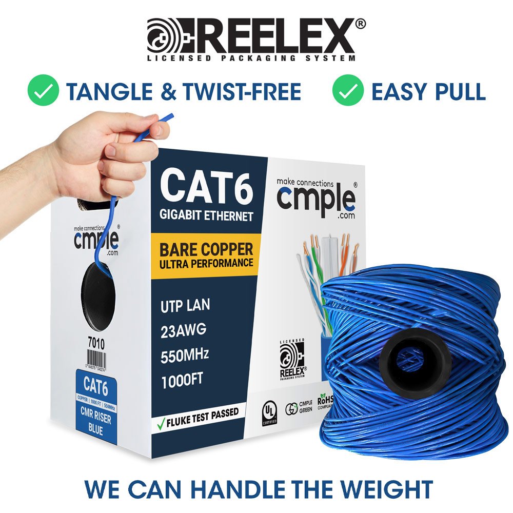 Maximize your network's potential with the Cmple Cat6 Gigabit Ethernet Cable. Designed with high-speed data transfer and reliability in mind, our Ethernet cable provides the perfect solution for your networking needs. High-Quality Construction: Our UL-certified cable is built with 23 AWG bare copper, ensuring top-tier performance, longevity, and unmatched signal quality. Power Over Ethernet (PoE) Support: With the ability to carry both data and power over a single cable, our Cat6 Ethernet Cable Supports Power over Ethernet - PoE/PoE+/PoE++ (IEEE 802.3af/at/bt) 4PPoE up to 100W.. Ideal for powering IP cameras, VoIP phones, WiFi access points, and other PoE-enabled devices. CMR Riser Rated: Perfectly suited for vertical riser applications, this cable can be safely routed between floors in non-plenum areas. Excellent for large-scale installations in homes, businesses, or data centers. High-Frequency Performance: Operating at a swift frequency of 550Mhz, our Cat6 cable ensures reliable, high-speed data transfer for bandwidth-intensive applications. Experience uninterrupted streaming, gaming, and other data-heavy activities. Unshielded Twisted Pair (UTP): The cable features UTP design to minimize electromagnetic interference, maintaining stable, high-speed data transmission. This ensures superior performance for all your networking applications. Packaged in a Reelex Box: To make your installation tangle-free, our cable is delivered in a Reelex box. This patented packaging system prevents snags, tangles, and kinks, ensuring efficient and smooth deployment. Engineered with 23 AWG bare copper for superior performance, this UL-listed cable features Power over Ethernet (PoE) support, simplifying network setups by carrying data and power over a single line. 1000 Foot cable is perfect for large installations. Suitable for homes, offices, data centers, educational institutions, hospitality businesses, and healthcare facilities.
