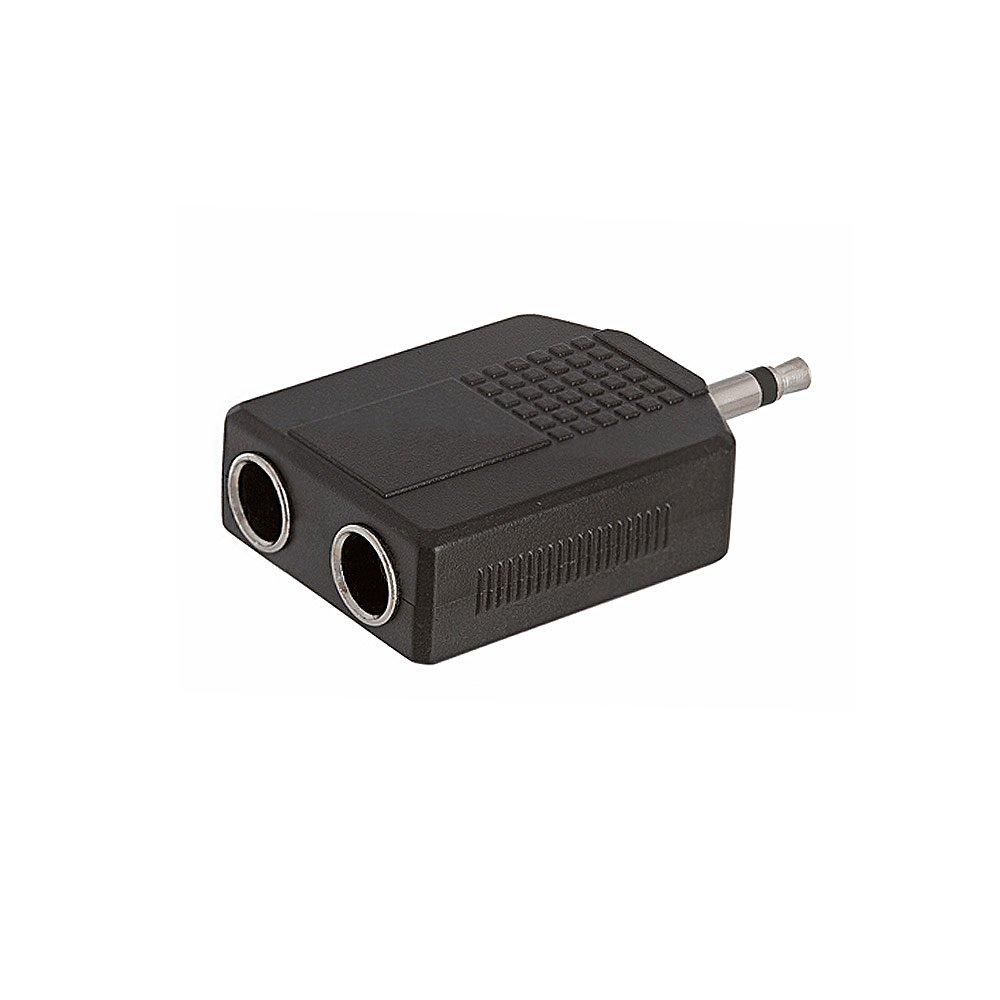 3.5mm Mono Plug to 2x6.35mm Mono Jack Adapter This 3.5mm Mono Plug to 2x6.35mm Mono Jack Adapter converts two 6.35mm Mono Plugs to single 3.5mm Mono Plug. With its full molded construction, this splitter will split the audio signal without a loss of quality. Black molded plastic construction Nickel-plated contacts Connector 1: 3.5mm Mono Plug Connector 2: 2x6.35mm Mono Jack Use with PC, stereo, MP3 players External Length / Height: 50mm Body width: 27mm