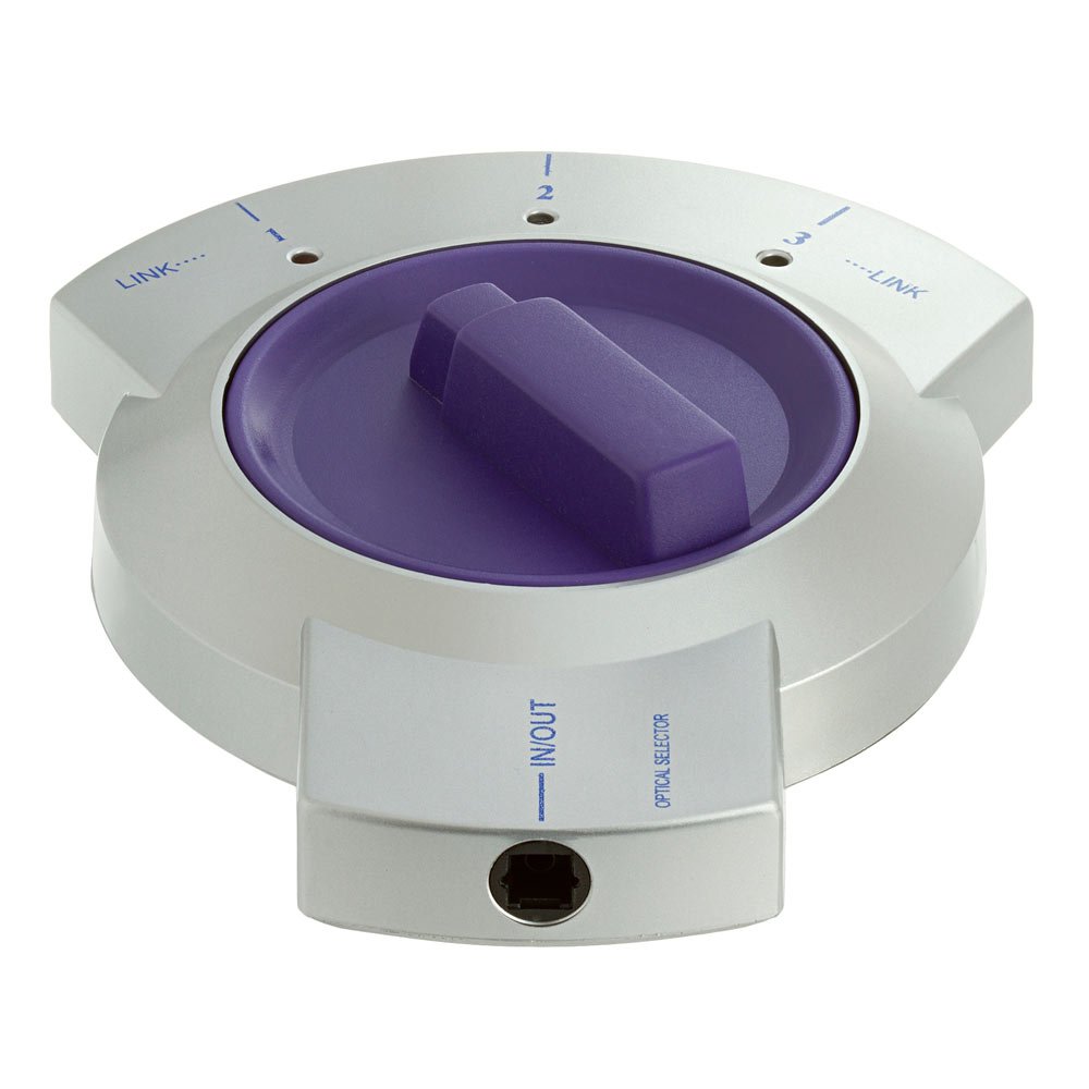 Optical Toslink Jack to 3xToslink Jacks 3-Way BI-Directional Selector Optical Toslink Jack to 3xToslink Jacks 3-Way Selector Connects up to three (3) different optical digital components to a single component and allows more hookup flexibility for your digital components. Increase your flexibility by adding up to three sources to your home theater system's optical digital audio input. This selector features high integrity toslink jacks to optimally transfer light signals, and to prevent the wear and tear on your toslink cables that comes from manually reconnecting cables. The compact size of this switch lets you place it almost anywhere. Great for DVD players, DAT, audio CD recorders, game consoles, CD players, Mini Disc, sound cards, receivers and decoders. Plug and Play, easy to operate Easily switch from one component to another with the turn of a knob. No more disconnecting and reconnecting cables when switching devices Interference and distortion free signal transmission Inputs: 1 x TosLink optical inputs Outputs: 3 x TosLink output (bi-directional Color: Silver/ purple Do not require a power source Suggested Applications: Digital receivers / CD / DVD players / Video game console / PS3 / XBOX 360 / MD MiniDisc player / cable / satellite receivers / Blu-ray / HD DVD / computer sound cards via Digital Optical Audio Toslink Cables