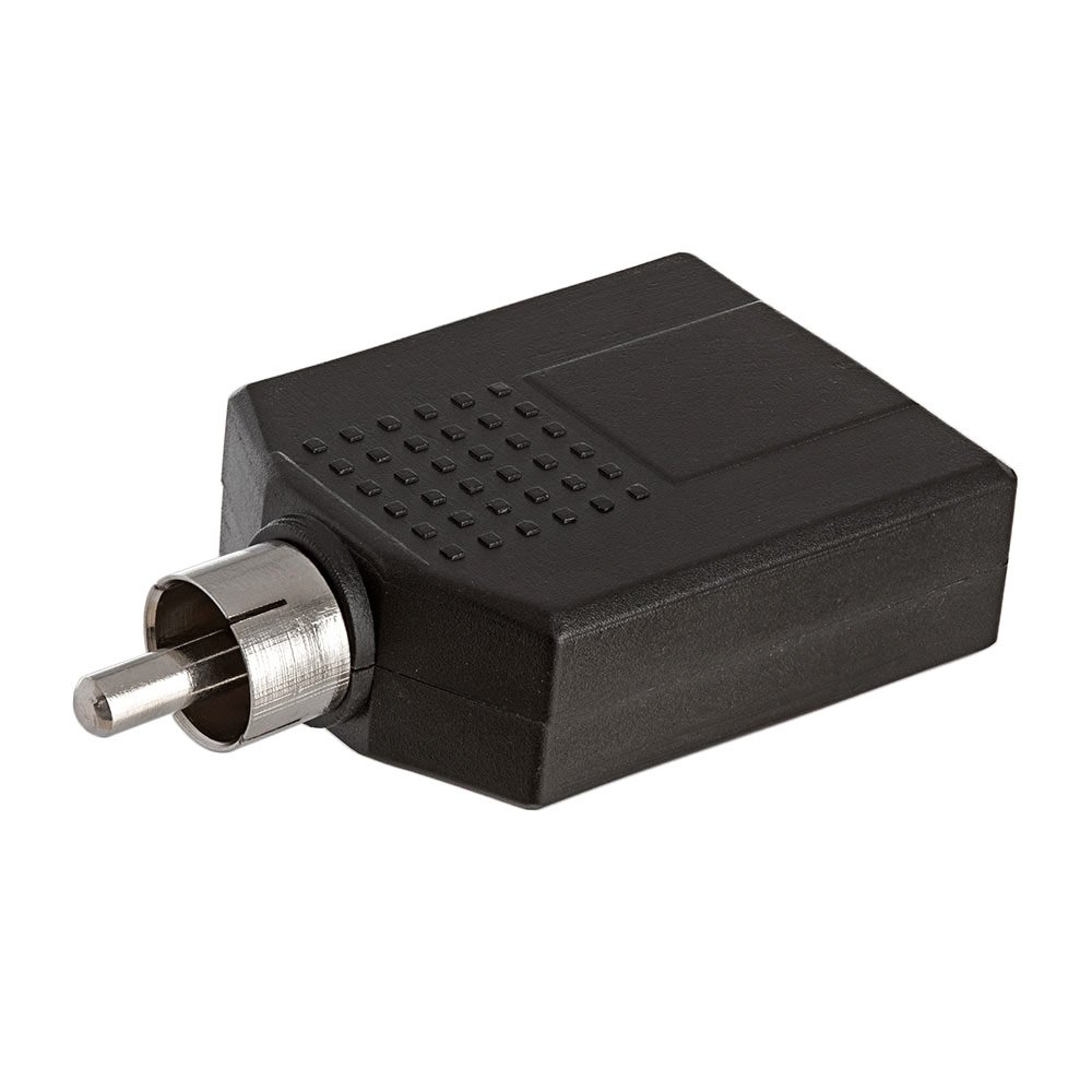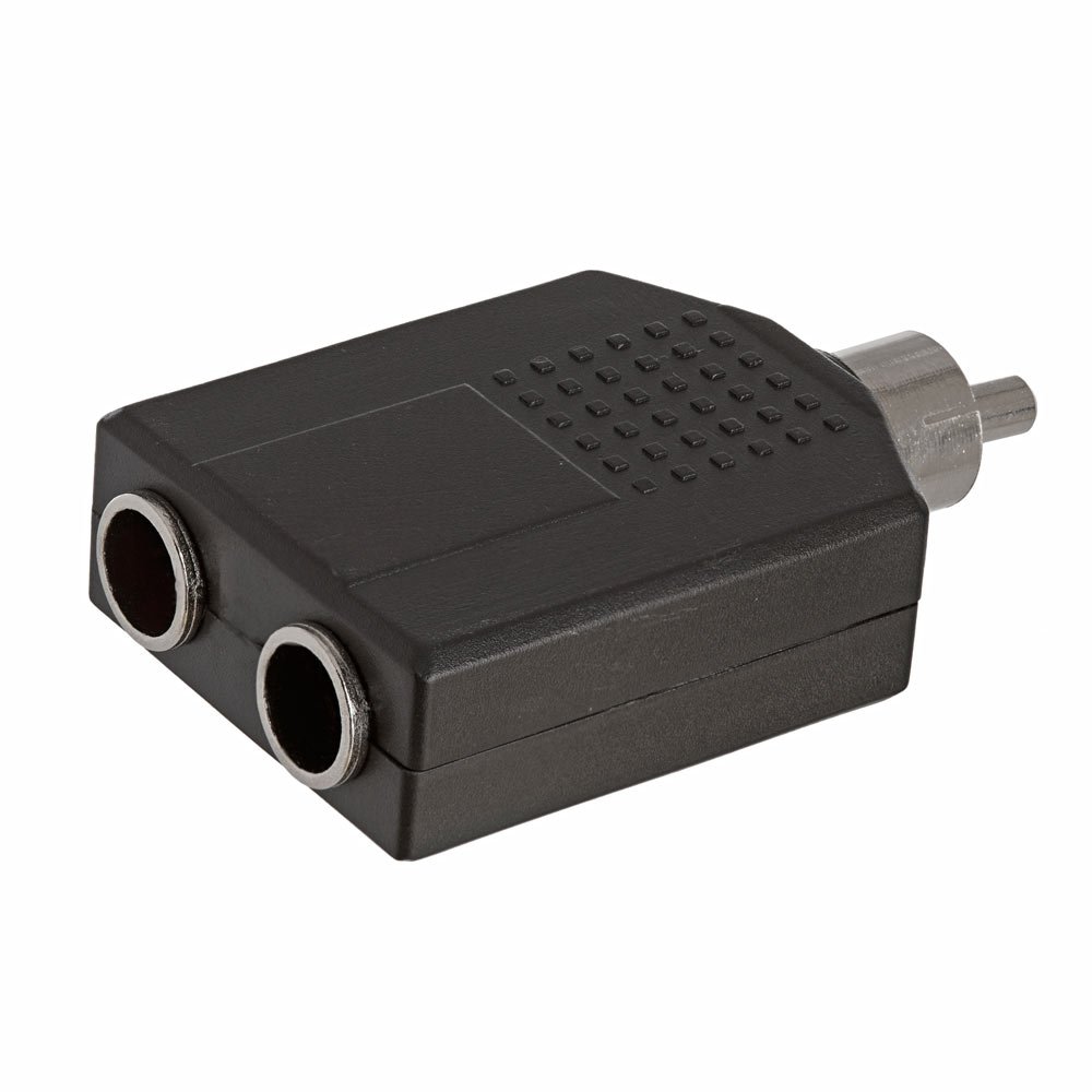 RCA Plug to 2x6.35mm Mono Jack Adapter This RCA Plug to 2x6.35mm Mono Jack Adapter converts two 6.35mm Mono Plugs to single RCA Plug. With its full molded construction, this splitter will split the audio signal without a loss of quality. Black molded plastic construction Nickel-plated contacts Connector 1: RCA Plug Connector 2: 2x6.35mm Mono Jack Use with PC, stereo, MP3 players External Length / Height: 50mm Body width: 27mm