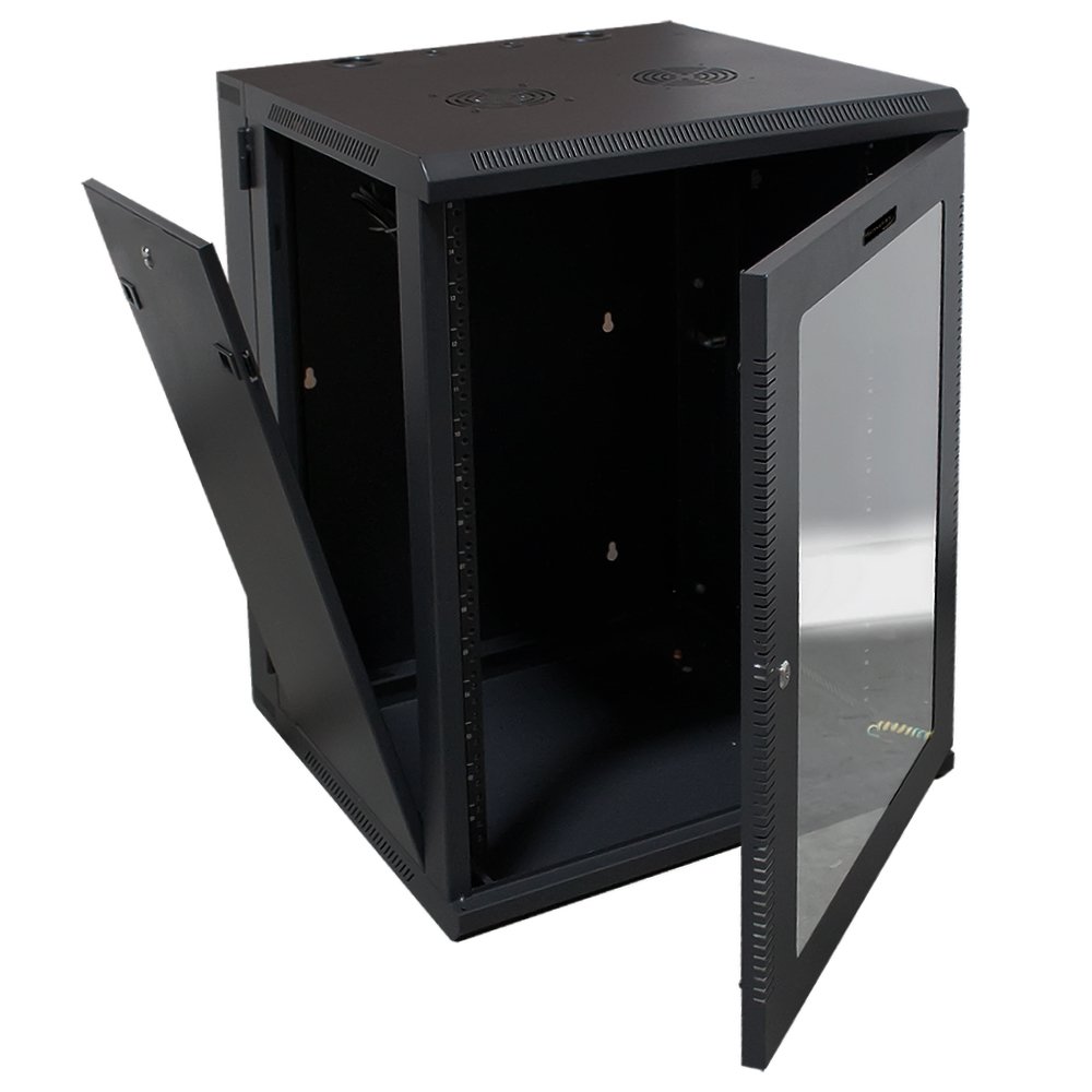 18U Wall Mount Cabinet (CBTF-WM18U-1032) Organize your Ethernet cabling and provide increase stability to your work environment. Save valuable floor space, by wall-mounting the enclosure. The wall-mounted design makes this enclosure the ideal solution for optimizing equipment storage in your classroom, retail store, server room, or office.This 18U server rack cabinet lets you mount your EIA-310 compliant equipment to the wall. The enclosure features a mounting depth of up to 24 in. and offers a maximum load capacity of 130 lbs. (59 kg) when properly secured.This server rack enclosure features heavy-duty steel construction, with a black powdered coated finish that ensures that they keep all edges and surfaces smooth, greatly reducing the possibility of injury or wear on cable jackets.Each door and panel on this rack features an independent lock, ensuring your equipment is secure. The cabinet is hinged to swing away from the wall mount bracket, so you’ll have convenient access to equipment.To ensure your equipment is running at an optimal temperature, the server cabinet promotes passive cooling. It features an extra slot for additional fan and vented top, bottom, and side panels enable air circulation.The back of the cabinet has oval-shaped holes for easy attachment to standard wall framing elements. Our wall mount cabinets are expertly built for durability and longevity!Features:Vented at sides top and bottomOne extra slot for the additional fan(One 68CFM pre-installed)Lockable front, rear doors, and side panels for added security24” depth, useable is 18“, (3 sets) of 16” on center mountClear tempered plexiglass front doorMaterial: Cold rolled steel with a black powder finishMax capacity: 130lbsDimensions: 23.6”W x 35.6”H x 23.6”DColor: BlackPackage Includes:1 x Double Section Swing Out 18U Wall Mount Cabinet2 x Key1 x Pack of Mounting Hardware