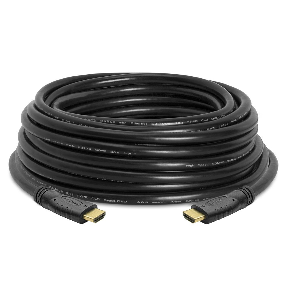 CL3 RATED FOR IN-WALL USE - CL3 rating for in-wall HDMI installations safeguards against potential fire risks. DURABILITY: Designed and built with only premium materials (durable PVC), which means this HDMI Cord can withstand thousands of 90 degrees bend tests and hold up to 20lbs. Category 3 Certified and 24K Gold-plated connector promotes efficient signal transfer WIDE COMPATABILITY: Compatible with any HDMI device, such as Blu-ray, game consoles, stereos, PCs and more. Compliant with High-Speed HDMI with Ethernet specifications 4K VIDEO SUPPORT - 2160p / 60Hz. Our High Speed HDMI cables support resolutions up to 4Kx2K (UHD) (QHD) including 4096x2160, 3840x2160, 2560x1600, 2560x1440, 1920x1200, 1080 and 1080p PACKAGE INCLUDE: 1 x Uni-Directional Cmple 4K Ultra High Speed HDMI Cable for In-Wall Installation - 50 FT. Backed with Cmple Lifetime Warranty Cmple High Speed HDMI cables connect a wide range of HDMI devices. Use it to extract the maximum performance from your gaming or home theater setup. Durably built for clear signals & minimal interference/physical strain, the Cmple In-Wall HDMI cable is triple-shielded with solid copper conductors and flexible PVC jacket. These high-quality cables deliver high-definition video and multichannel, digital audio with increased performance characteristics and greater accuracy. With its fully tested high specifications and in-wall fire rating, the Cmple CL3 High Speed HDMI Cable will future-proof your Audio/Video project for years to come. Longevity and Durability The HDMI cable is made of a PVC outer layer that protects from physical strain, external interference & maintains efficiency of the digital signal Quality Picture and Sound• Latest version HDMI cable supports 4K@60hz, UHD, HDR, 3D content, Ethernet and Audio Return Channel• 4K, UHD, 2160p, 1440p, 1080p, 1080i, 720p, 480p, and 480i Resolutions• Supports Refresh Rates of up to 240hz and 48-Bit Deep Color• Supports Transfer Rates of Up to 340Mhz or 10.2gbps• Works with all HDTVs, Blu-ray players, Xbox 360, PS3 and other HDMI devices• Supports True HD Dolby 7.1 and DTS-HD Master Audio• HDCP 2.2 CompliantUp to 32 Audio Channels• For a multi-dimensional immersive audio experience • Goes beyond traditional inchsurround soundinch and delivers clearly perceptible, three dimensional, positional audio experience with up to 32 discrete channels 4K @ 60hz • Same resolution as many inchstate of artinch digital theaters • Cmple HDMI Cables reproduce, rich, natural, lifelike colors in videos and photos • Enables real-time signaling of content types between display and source devices CL3 Rated For In-Wall Use • Cmple Cables are CL3 approved • Fire-resistant PVC Jacket make the Cmple CL3 Rated cable ideal for in-wall installationUni-DirectionalInstallation Note: This UniDirectional HDMI Male to Male Cable with Source Interface (Transmitter unit) for connecting HDMI source; Display Interface (Receiver unit) for connecting your HDMI display device.