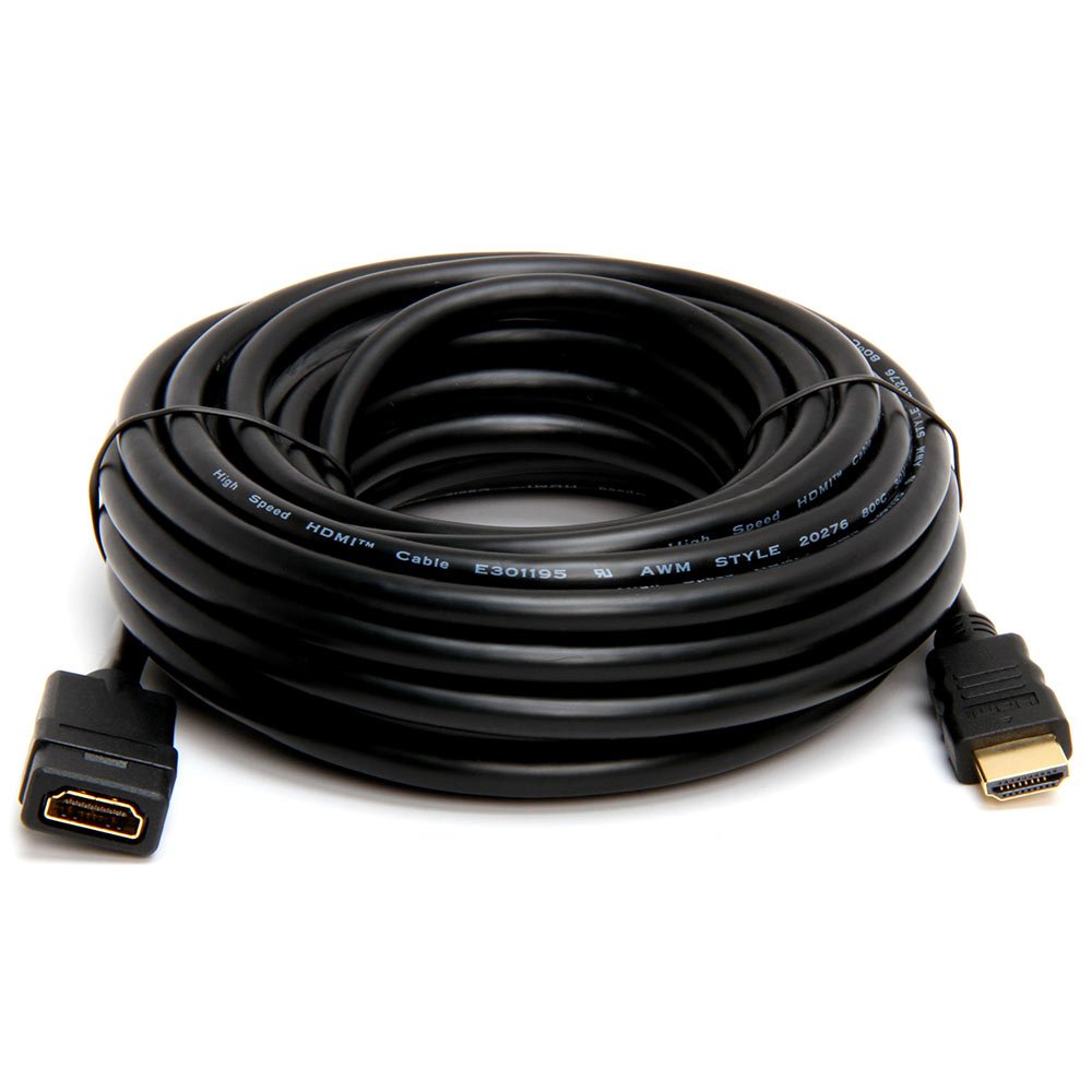 25-foot HDMI Cable extension Male to Female Gold Plated Convenient way to extend that pre-existing cable when it's just not quite long enough. Low loss, heavy cable to keep from bottlenecking the signal transmission. Gold plated, corrosion resistant connectors. ROHS compliant. High quality, heavy duty, molded connector housings. Triple shielded design. UL listed. High-Definition Multimedia Interface (HDMI) is the first industry-supported, UNCOMPRESSED audio/video interface. This cable connects HDMI devices for DVD, satellite boxes, LCD, projectors, plasma and HDTVs. HDMI provides an interface between any HDMI-enabled audio/video source, such as a set-top box, DVD player, and A/V receiver and an audio and/or video monitor or projector. HDMI supports standard, enhanced, or high-definition video, plus multi-channel digital audio on a single cable. It transmits all ATSC HDTV standards and supports 8-channel digital audio, with bandwidth to spare to accommodate future enhancements and requirements. Specifications & Features: Connector Type: HDMI male to HDMI Female Connector Finish: Gold Length: 25ft # of conductors: 19 Conductor Plating: Tin Shielding type: EMI Supported Resolutions: 480i to 1080p HDMI Certified: Yes HDCP Compliant: Yes CEC Compliant: Yes ROHS Compliant: Yes 1.3 Device Compatible: Yes Supports DVD Audio: Yes Supports SACD: Yes UL File #: E119932 UL Style #: 20276 VW-1: Yes Voltage Rating: 30V Shielding level: Triple Temperature Rating: 80°C Rated Bandwidth: tested to 165 Mhz Supports TrueHD & DTS-HD: Yes