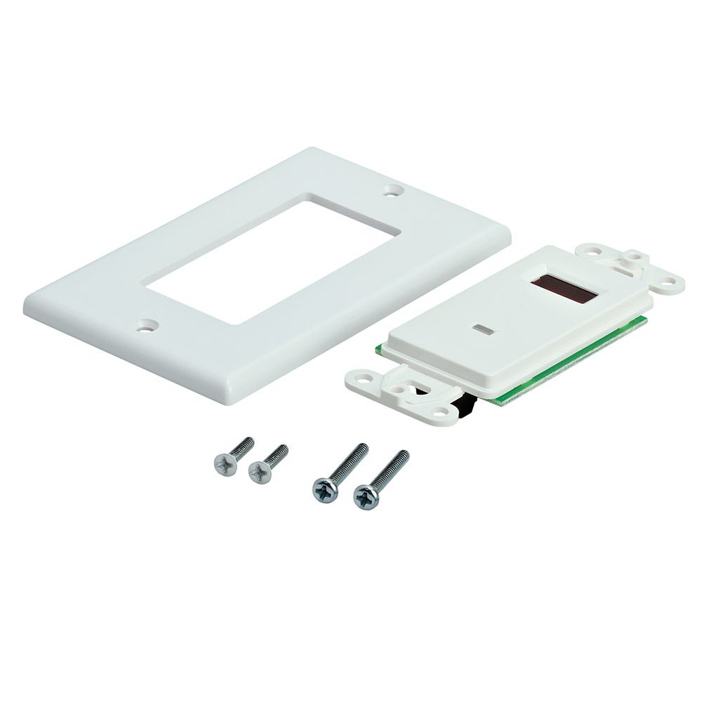 In-Wall Infrared Receiver receives IR signals from a handheld IR remote control and relays this to the audio/video equipment for operation from another room. Mounts to a single gang standard electrical box using a decorate cover plate. FEATURES Stylish decorate design. Available in white colors. Dual color LED. Green for system status and Blue for talk back. Ultra thin design. Mounts easily in any J-box or P-ring. Wide band IR. Receives IR from many types of remotes. SPECIFICATIONS Receive Frequency Range: 34 kHz to 60 kHz Transmit Frequencies: 38 kHz to 56 kHz Range: 40ft @ 38 kHz 25ft @ 56 kHz Power requirements: 12VDC, 30mA max Wire Requirements: 2 twisted Pair, with our without shield Some HD Cable or Satellite operates at higher frequency signal. Cable Boxes like the SA HDTV DVR's and Direct TV H21. We recommend to use CAT5 or CAT6 twisted cable for installation.
