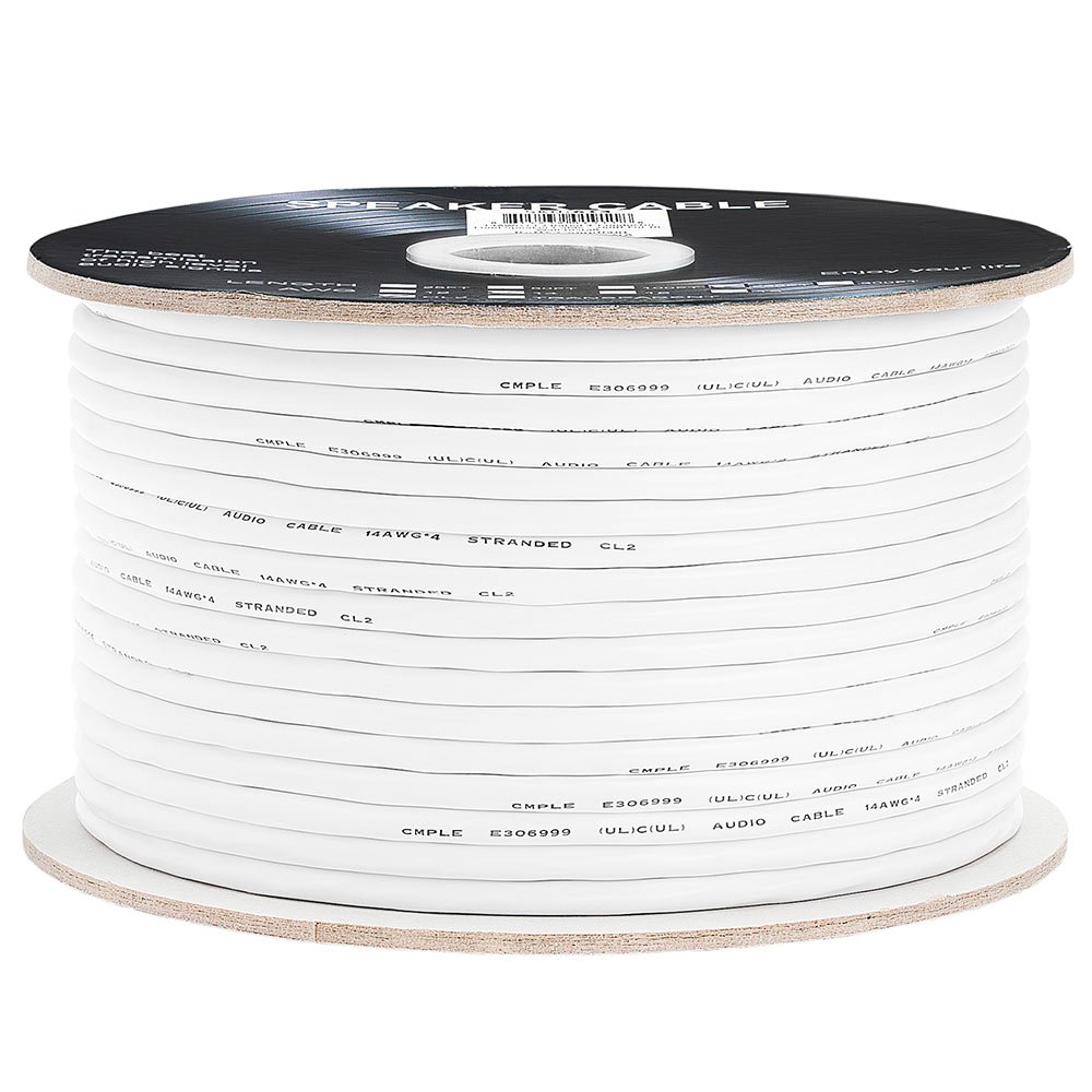Cmple - 14 Gauge 4 Conductor CCA Speaker Wire Cable - White This 14 AWG and CL2 rated speaker wire is an ideal choice for connecting your loud speakers to an AV receiver or amplifier in a 2.1, 5.1, or 7.1 channel home theater system. CCA wire offers the same signal frequency and reliability in terms of corrosion resistance to copper wire. The advantage of the CCA speaker wire is lighter and more flexible than copper wire. The cost of CCA vs Oxygen free copper is much lower and you can enjoy the same functions and reliability as copper wire without paying the extra cost for the installation. The cable is made of CCA Copper Clad Aluminum, ensuring high fidelity sound quality and providing maximum's conductivity and durability without paying the additional cost. The product go through many states of testing to ensure the highest performance and reliability of the products. Our Cmple speaker cable has durable PVC jacket which complies with the CL2 rating for the fire safety requirements. Four conductors are jacketed with color-coded PVC for easy polarity identification In-Wall Speaker Cable 14 AWG 4C In Wall Cable is optimized for use in a wide range of applications, including LED lighting installations such as white or single color LED strip light installations, LED tape light installations, CB radios, stereo/sound equipment and other low-voltage appliances. Made using premium quality materials and CL2 rated, flame resistant PVC. Highest Quality Material The cable is made of CCA Copper Clad Aluminum, ensuring high fidelity sound quality and providing maximum's conductivity and durability without paying the additional cost. In-wall rated The CL2 rating indicates that the cable complies with fire safety and insurance requirements making it safe for use inside the walls of residential class buildings. For flexible custom installation options. PVC jacket material Protects the interior cable and components from dust, moisture and breakages Easy Installation Wire your home easily with this speaker 14/4 wire. Its four CCA wires are covered with a specially designed finish, so it moves inside a wall with little resistance. The spiral geometry of this Cmple Audio cable minimizes sound going out of focus for more enhanced listening. High quality undistorted sound for your equipment Cable quality can have a huge impact on your speaker setup. Poor quality cable means poor quality sound. This 14 AWG speaker wire features CCA conductors, which means you get great sound quality for a great cost. Wide Compatibility Fits banana plugs, spade tips or bent pin connectors, which are typically compatible with audio components like speakers, A/V receivers, amplifiers and other professional sound applications Installation Intended for custom installs. Features and Specifications: Conductor count: 4 Gauge: 14AWG CL2 Rated Conduit: Copper-clad aluminum (CCA) Flexible and insulated PVC jacket Perfect for home theatre, car, RV and audio systems High quality undistorted sound for your equipment Outer Jacket Color: White Length: 250FT These cables are capable of delivering loud, clear and crisp audio reproduction limited only by the quality of the equipment you are using.