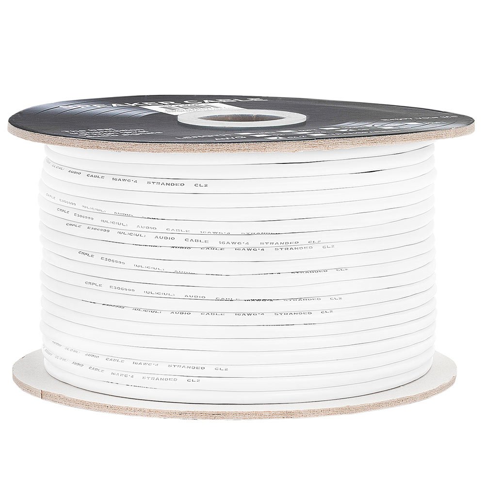 Cmple - 16 Gauge 4 Conductor CCA Speaker Wire Cable - White This 16 AWG and CL2 rated speaker wire is an ideal choice for connecting your loud speakers to an AV receiver or amplifier in a 2.1, 5.1, or 7.1 channel home theater system. CCA wire offers the same signal frequency and reliability in terms of corrosion resistance to copper wire. The advantage of the CCA speaker wire is lighter and more flexible than copper wire. The cost of CCA vs Oxygen free copper is much lower and you can enjoy the same functions and reliability as copper wire without paying the extra cost for the installation. The cable is made of CCA Copper Clad Aluminum, ensuring high fidelity sound quality and providing maximum's conductivity and durability without paying the additional cost. The product go through many states of testing to ensure the highest performance and reliability of the products. Our Cmple speaker cable has durable PVC jacket which complies with the CL2 rating for the fire safety requirements. Four conductors are jacketed with color-coded PVC for easy polarity identification In-Wall Speaker Cable 16 AWG 4C In Wall Cable is optimized for use in a wide range of applications, including LED lighting installations such as white or single color LED strip light installations, LED tape light installations, CB radios, stereo/sound equipment and other low-voltage appliances. Made using premium quality materials and CL2 rated, flame resistant PVC. Highest Quality Material The cable is made of CCA Copper Clad Aluminum, ensuring high fidelity sound quality and providing maximum's conductivity and durability without paying the additional cost. In-wall rated The CL2 rating indicates that the cable complies with fire safety and insurance requirements making it safe for use inside the walls of residential class buildings. For flexible custom installation options. PVC jacket material Protects the interior cable and components from dust, moisture and breakages Easy Installation Wire your home easily with this speaker 16/4 wire. Its four CCA wires are covered with a specially designed finish, so it moves inside a wall with little resistance. The spiral geometry of this Cmple Audio cable minimizes sound going out of focus for more enhanced listening. High quality undistorted sound for your equipment Cable quality can have a huge impact on your speaker setup. Poor quality cable means poor quality sound. This 16 AWG speaker wire features CCA conductors, which means you get great sound quality for a great cost. Wide Compatibility Fits banana plugs, spade tips or bent pin connectors, which are typically compatible with audio components like speakers, A/V receivers, amplifiers and other professional sound applications Installation Intended for custom installs. Features and Specifications: Conductor count: 4 Gauge: 16AWG CL2 Rated Conduit: Copper-clad aluminum (CCA) Flexible and insulated PVC jacket Perfect for home theatre, car, RV and audio systems High quality undistorted sound for your equipment Outer Jacket Color: White Length: 250FT These cables are capable of delivering loud, clear and crisp audio reproduction limited only by the quality of the equipment you are using.